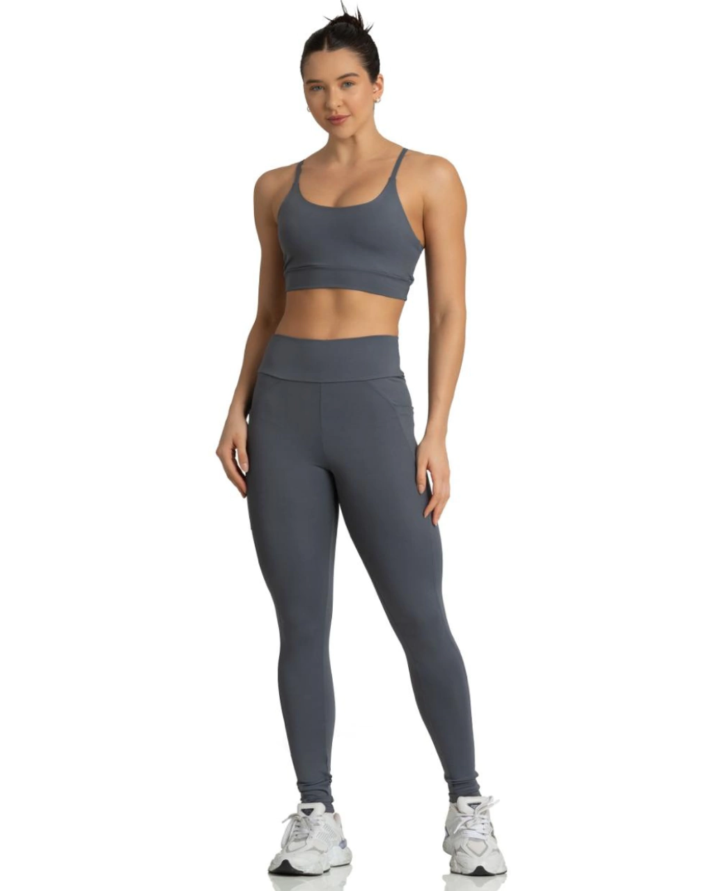 A calça possui cós alto bolso lateral funcional, ideal para levar celular, chave ou pequenos itens com segurança. O top conta com design anatômico, bojo removível e estrutura que valoriza a silhueta com sustentação e conforto.